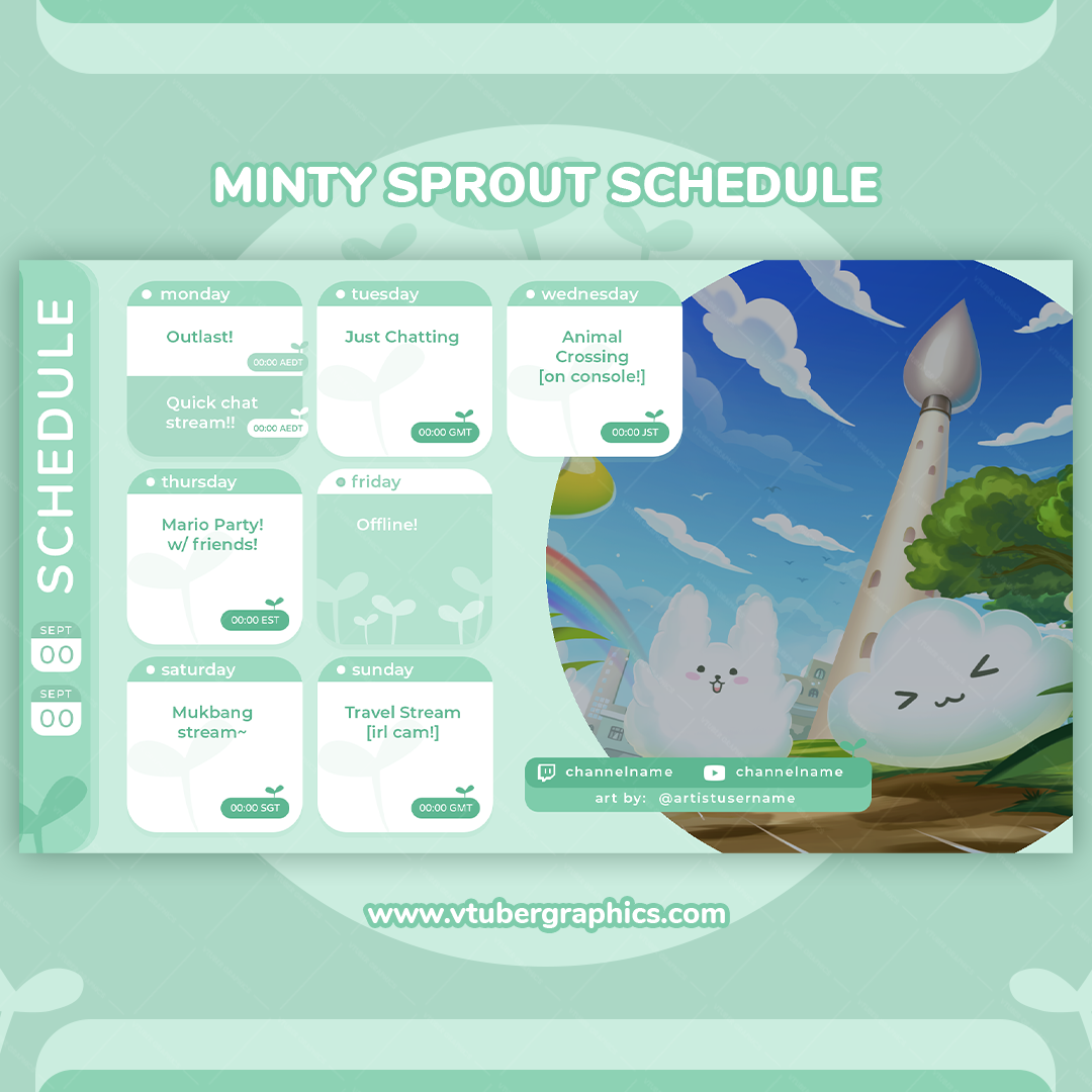 Keep your viewers updated with our Minty Sprout Schedule! Featuring a refreshing mint-themed design, this...