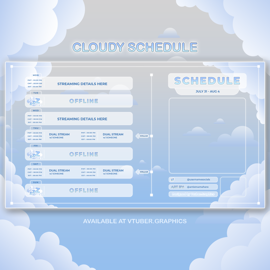 Upload your weekly streaming schedule with the help of Cloudy Schedule! Its airy, cloud-themed design helps...