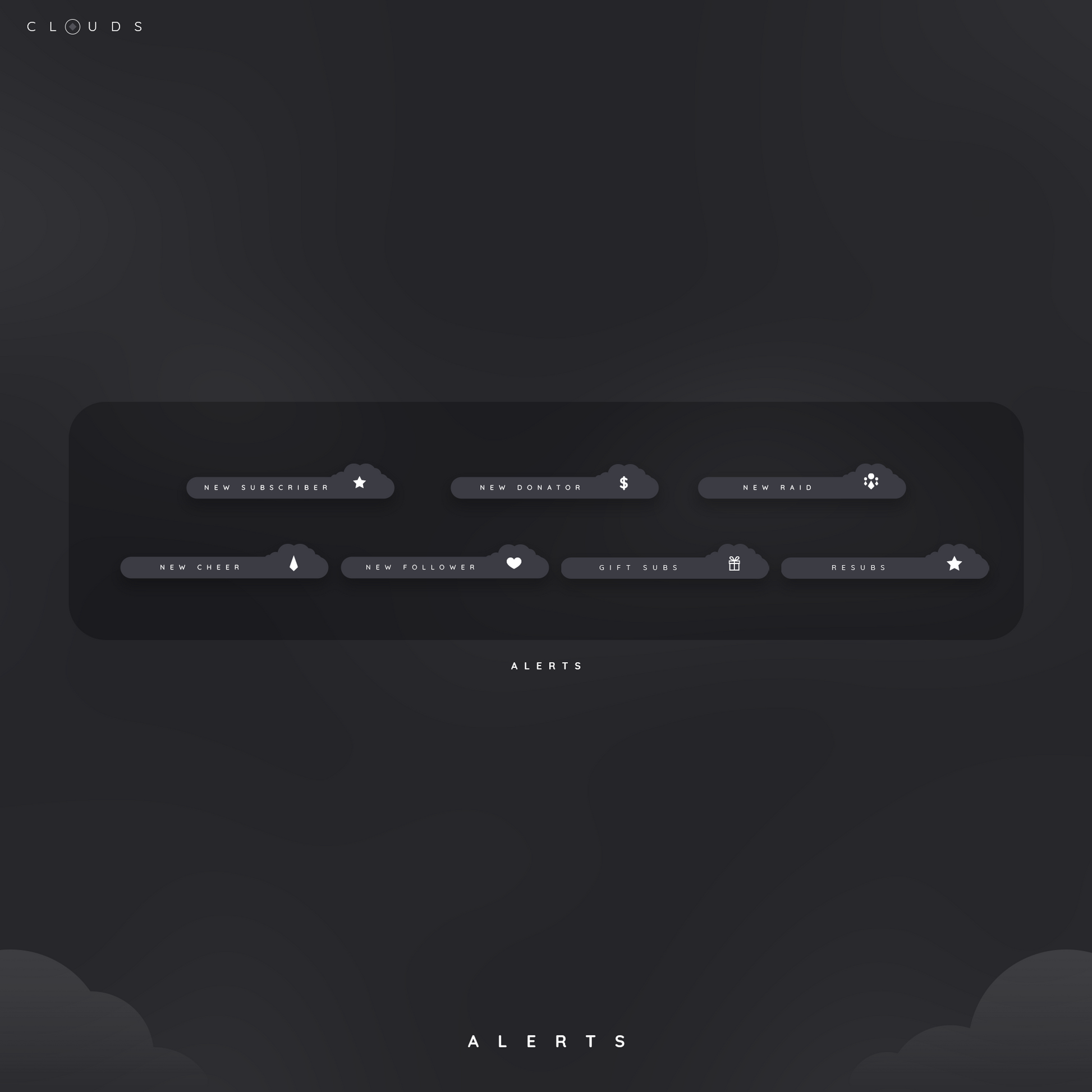 - 7x Animated & Static Alerts: New Cheer, New Donator, New Follower, New Raid, New Subscriber, Resubs & Gift Subs