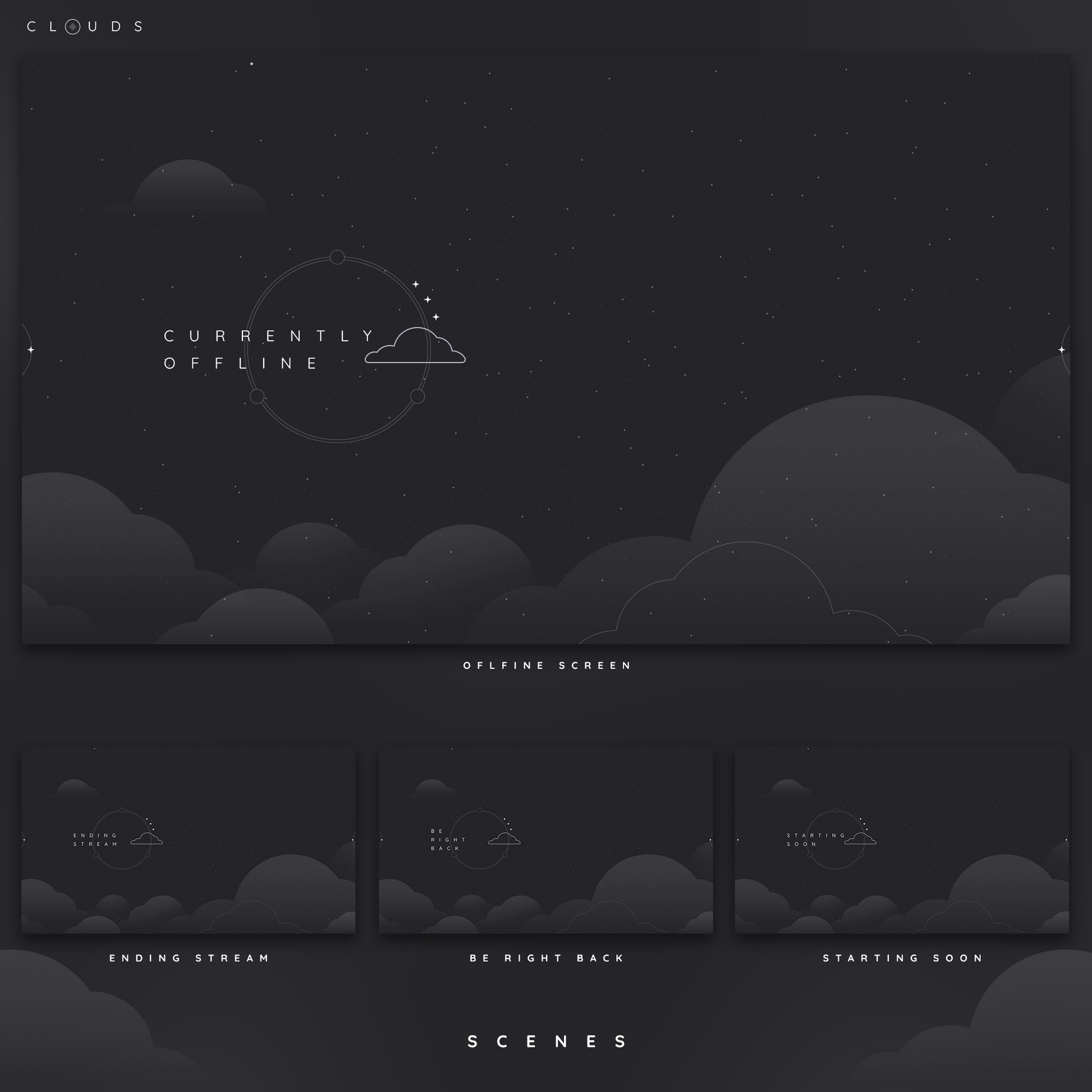 Introducing Clouds Stream Package - an ethereal cloud themed set created in Dark Mode to allow for easy viewing on your audience's eyes. Have your viewers watch your stream for longer hours with less strain on their sight. Crafted for Twitch and YouTube streamers who adore a touch of aesthetic with cloudy night skies! ☁️🏮✨