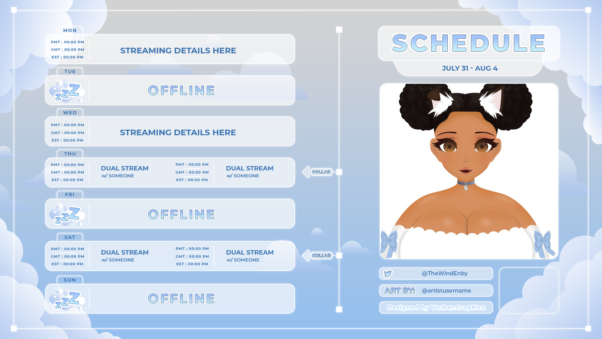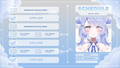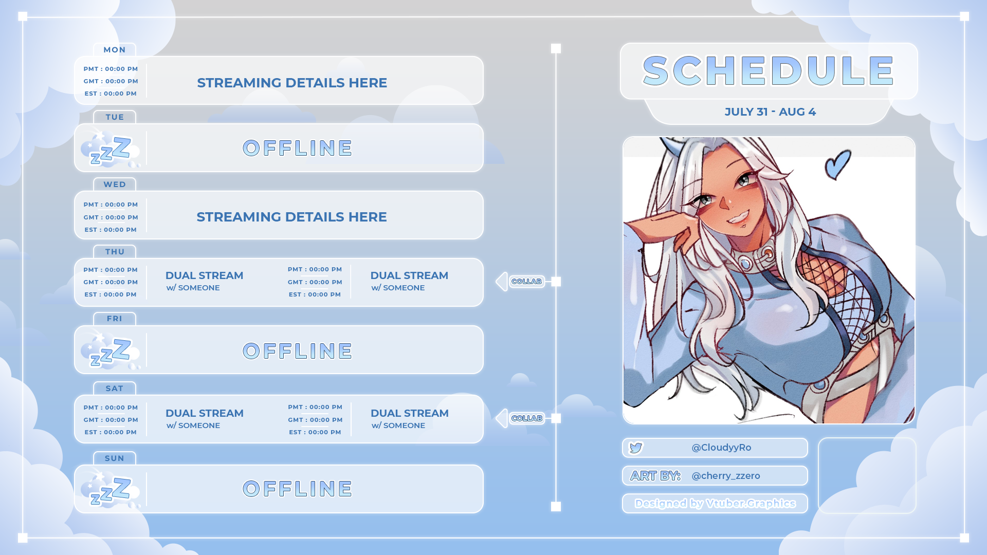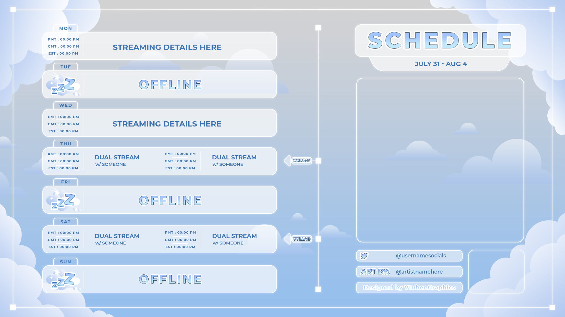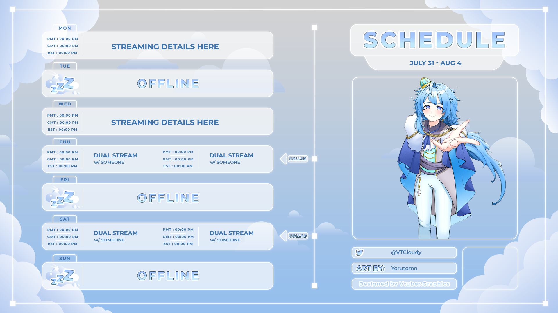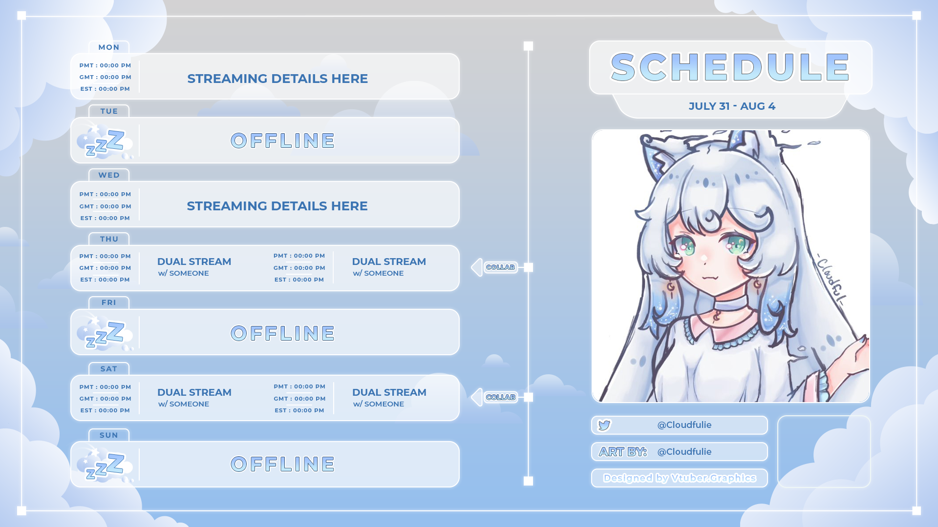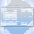Upload your weekly streaming schedule with the help of Cloudy Schedule! Its airy, cloud-themed design helps your viewers stay up to date with what you'll be streaming each week on YouTube or Twitch. Keep things organized and on-track with this cute and efficient schedule design.