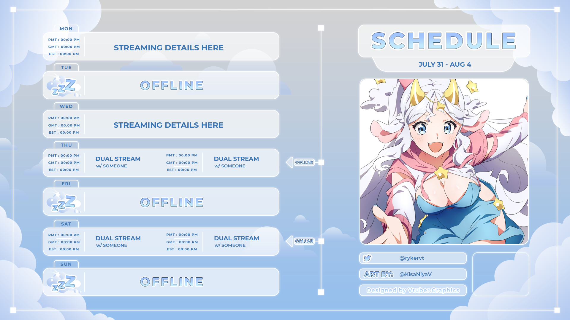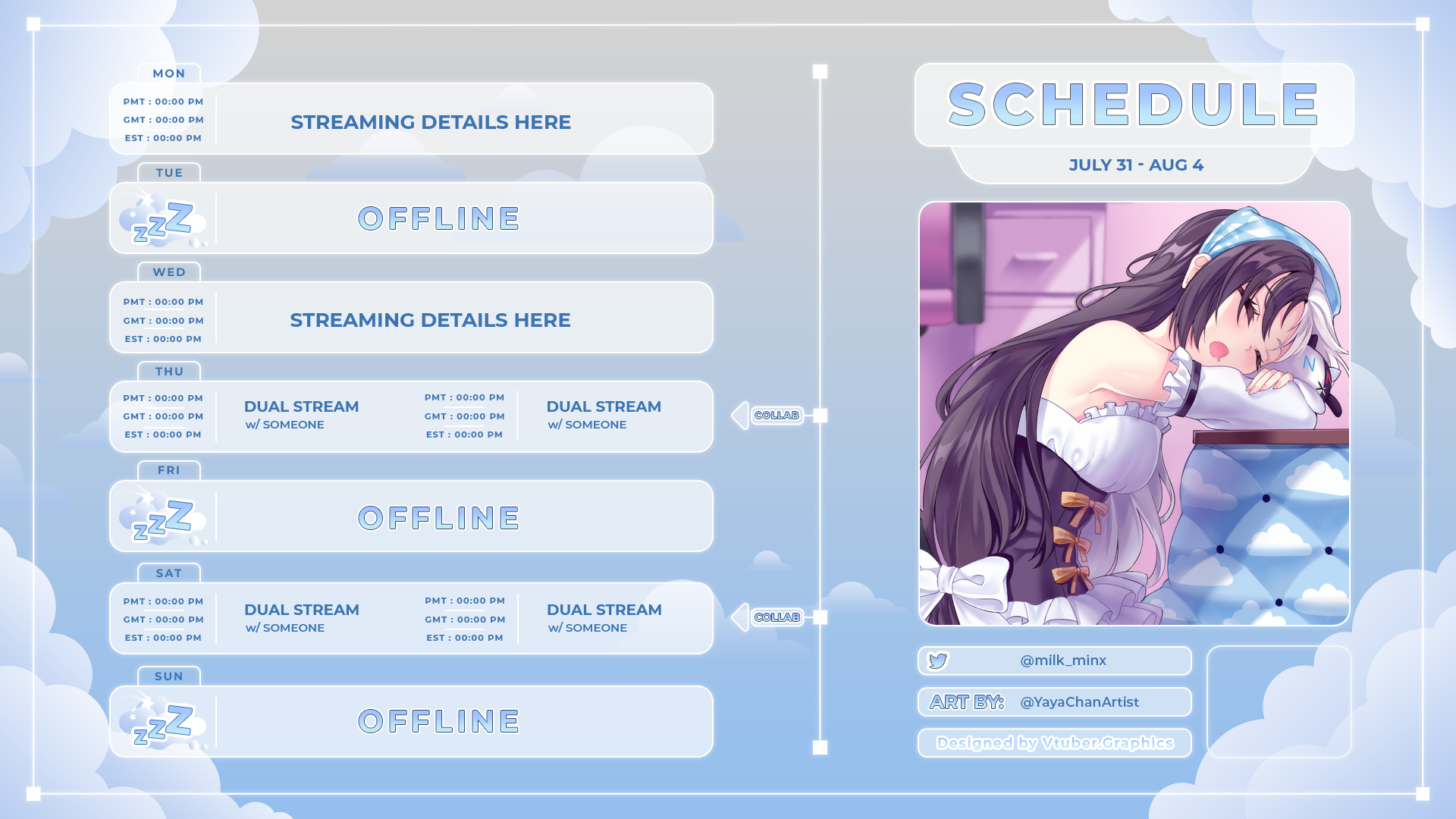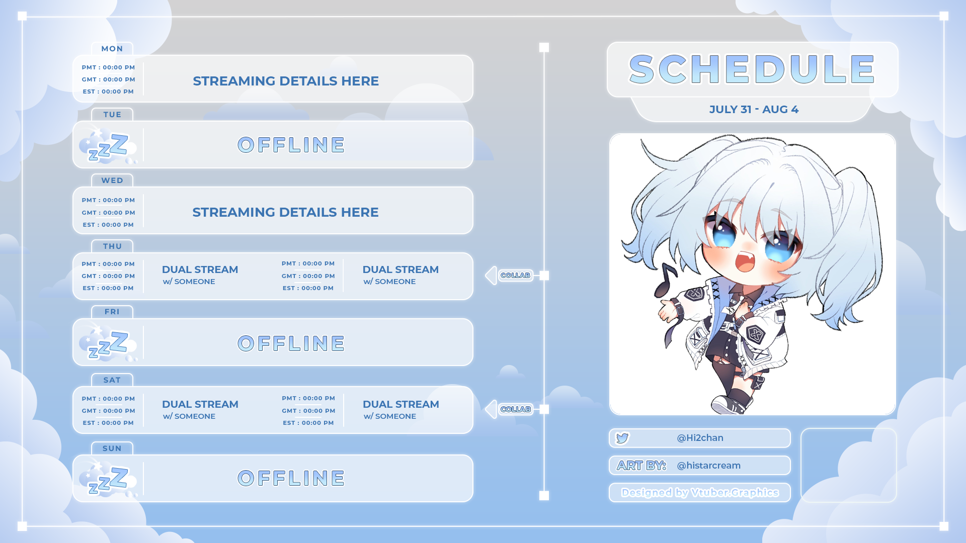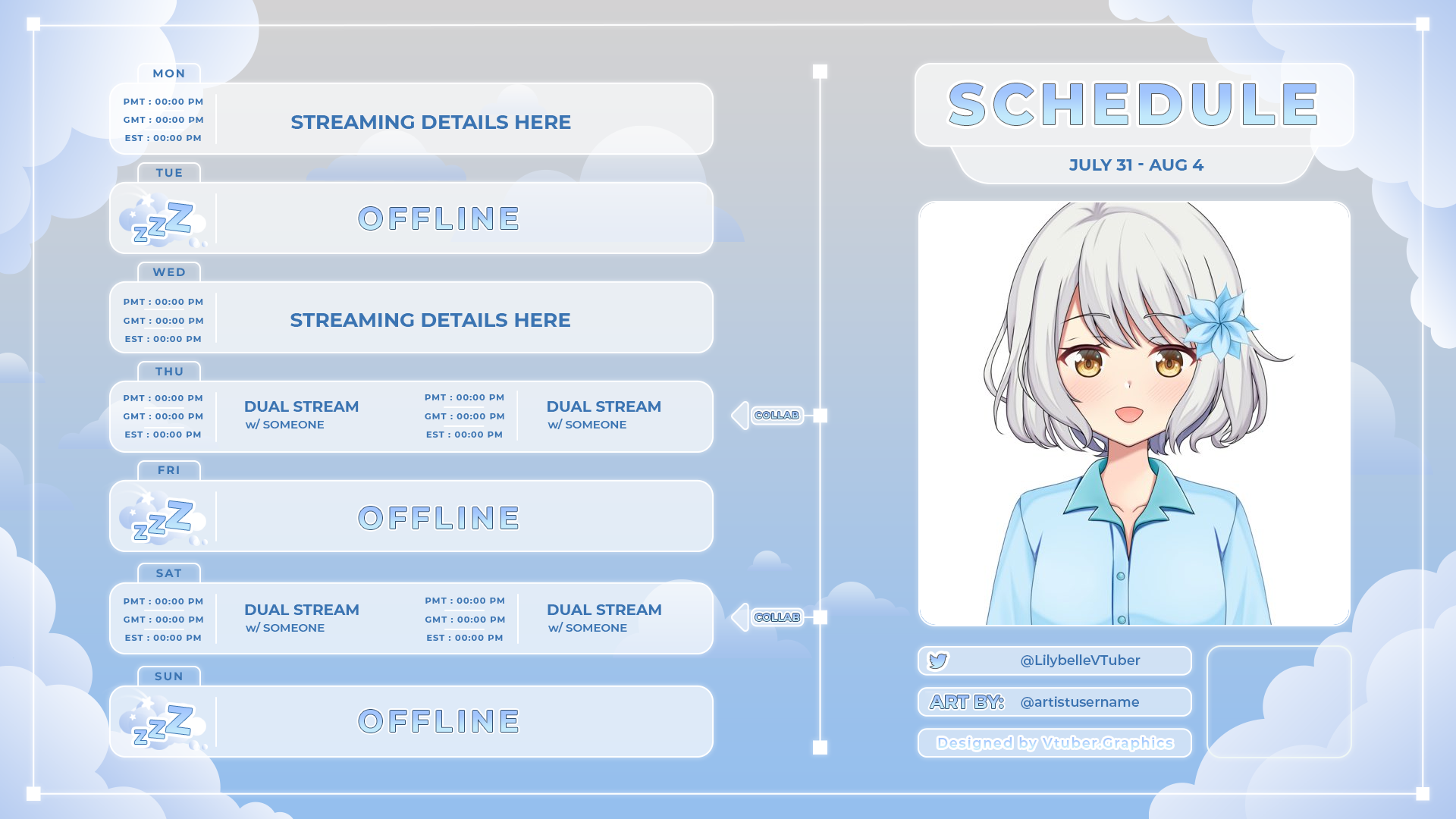 Upload your weekly streaming schedule with the help of Cloudy Schedule! Its airy, cloud-themed design helps your viewers stay up to date with what you'll be streaming each week on YouTube or Twitch. Keep things organized and on-track with this cute and efficient schedule design.