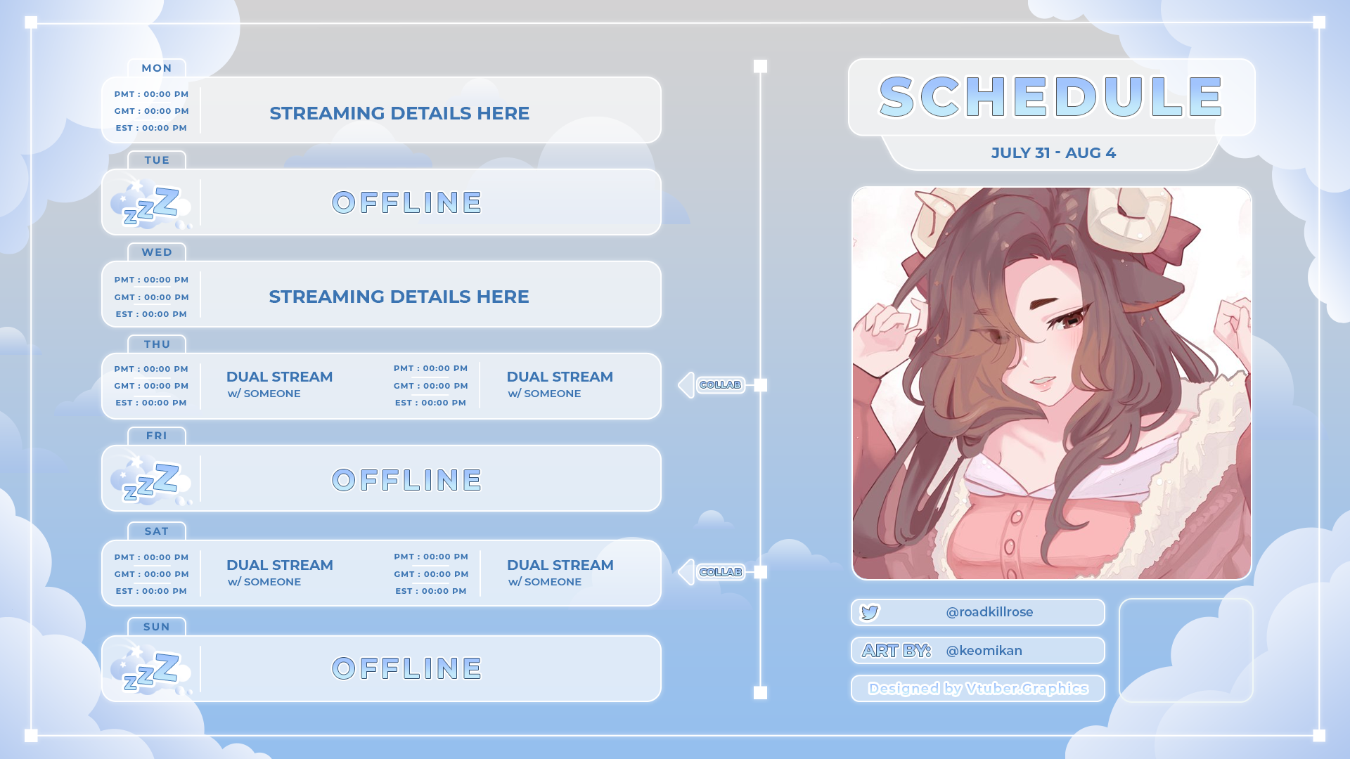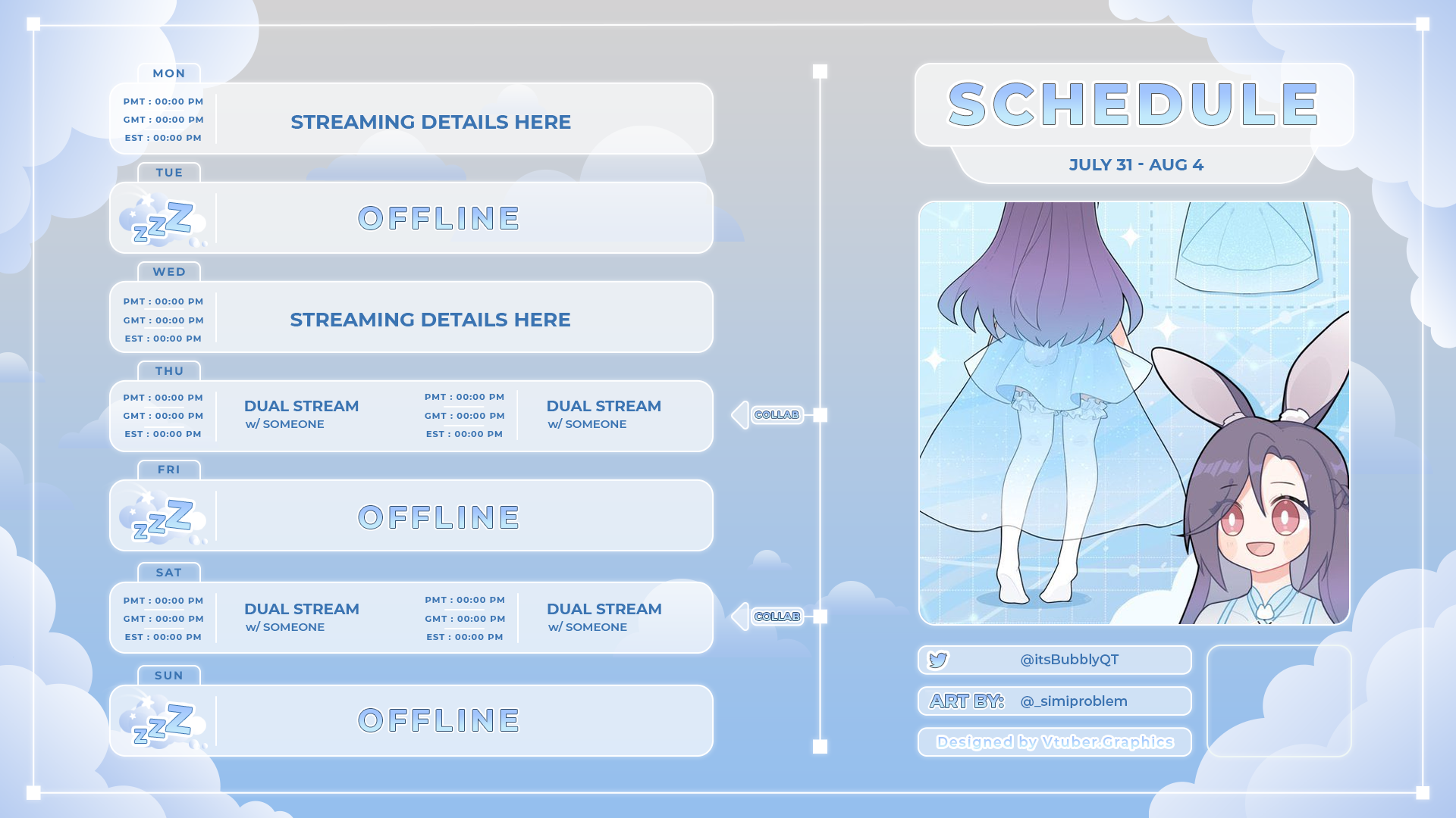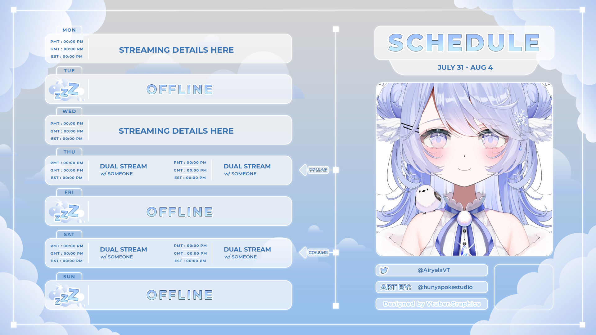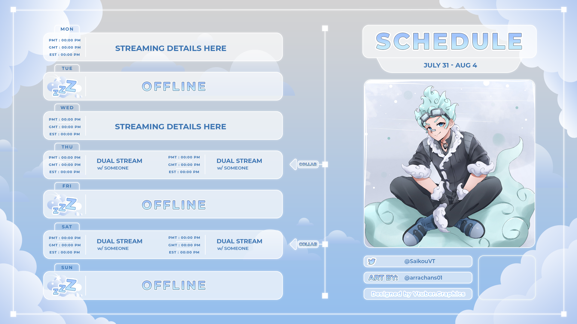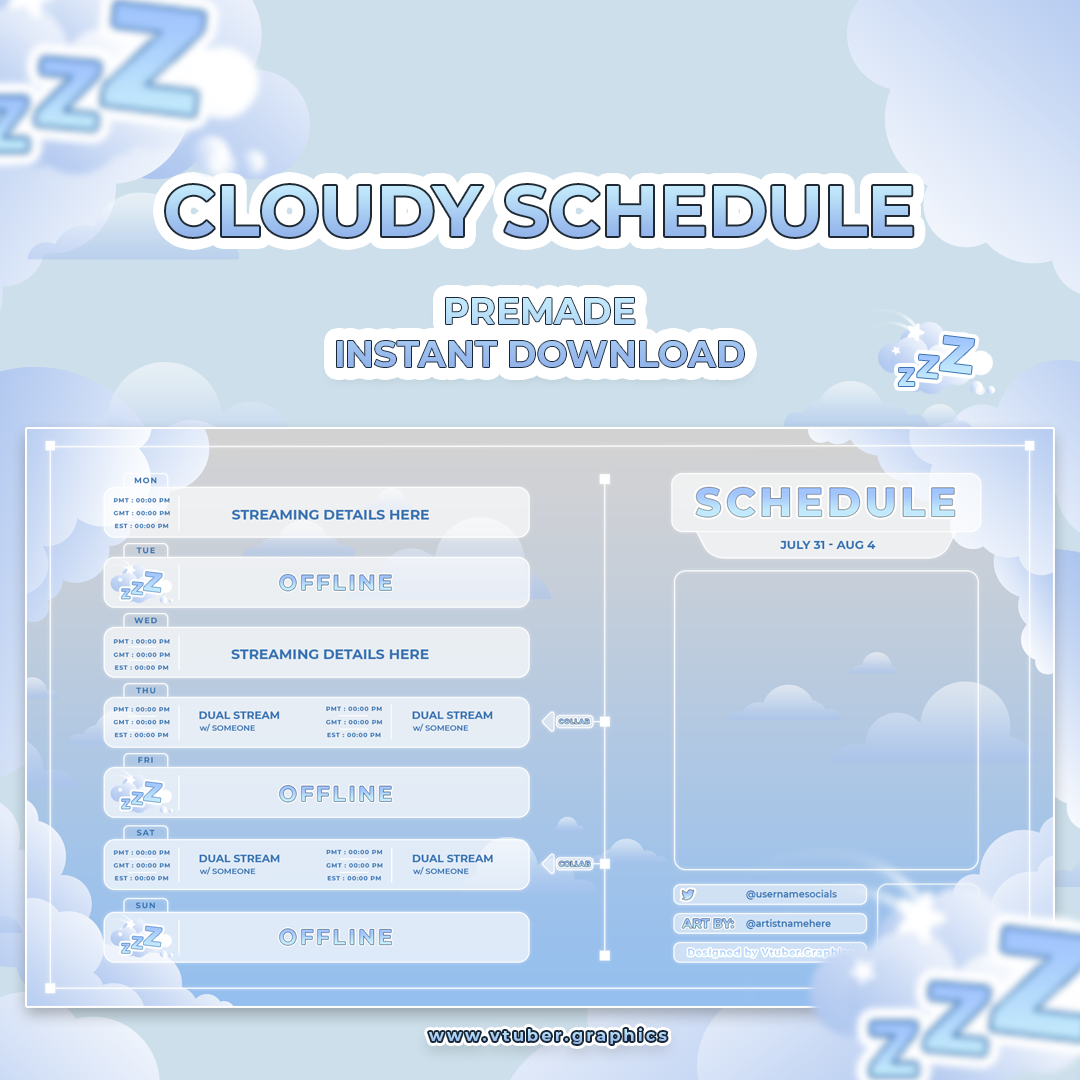 Upload your weekly streaming schedule with the help of Cloudy Schedule! Its airy, cloud-themed design helps your viewers stay up to date with what you'll be streaming each week on YouTube or Twitch. Keep things organized and on-track with this cute and efficient schedule design.