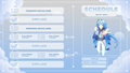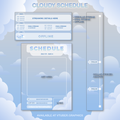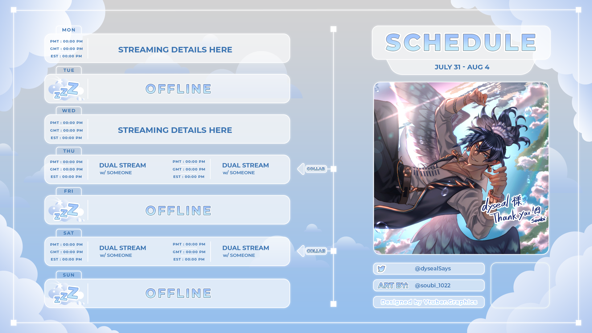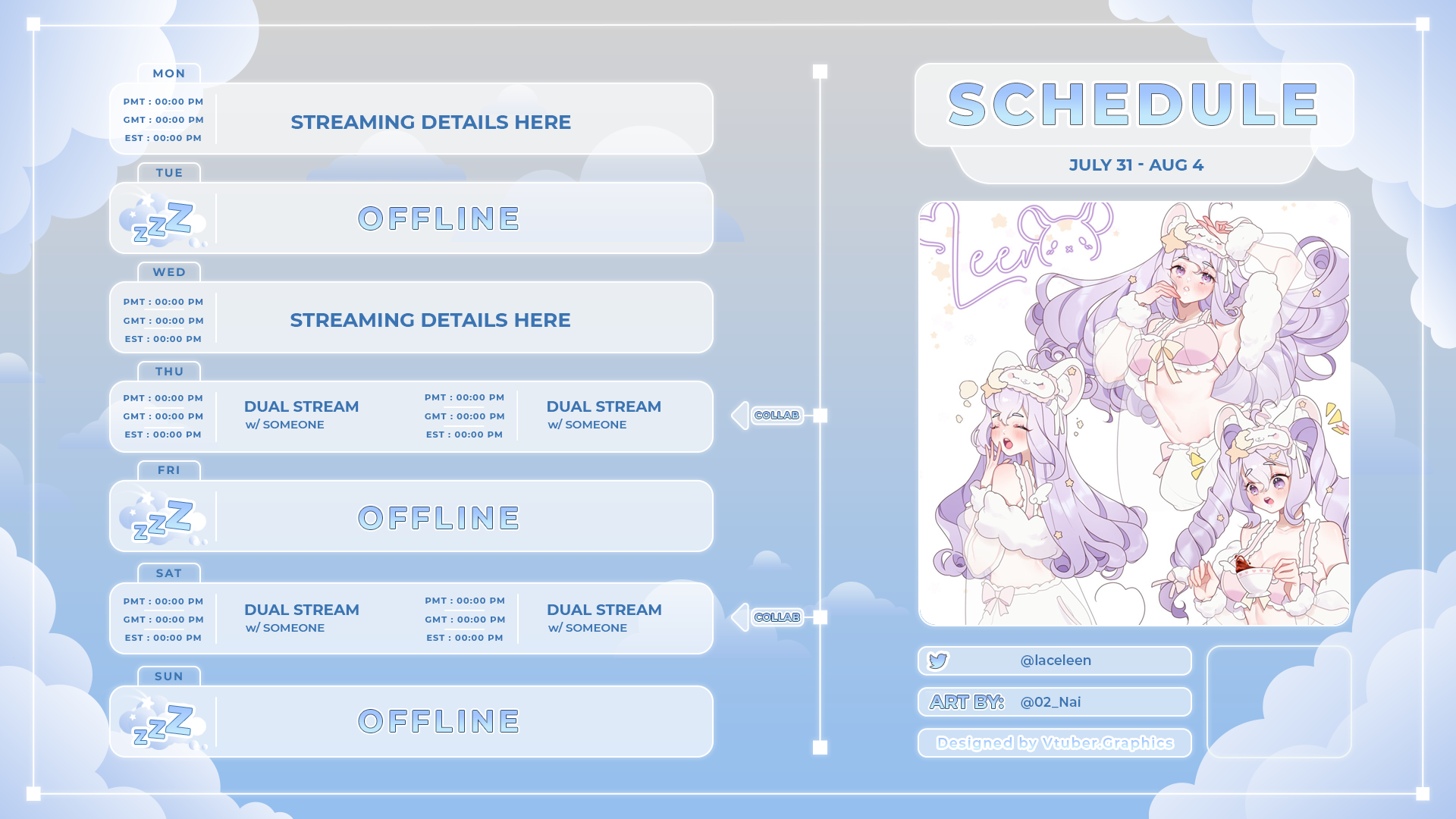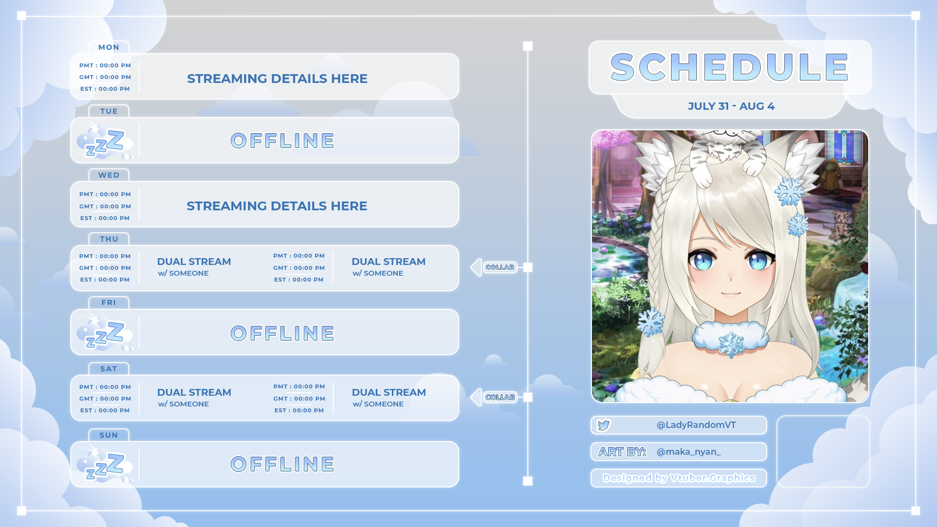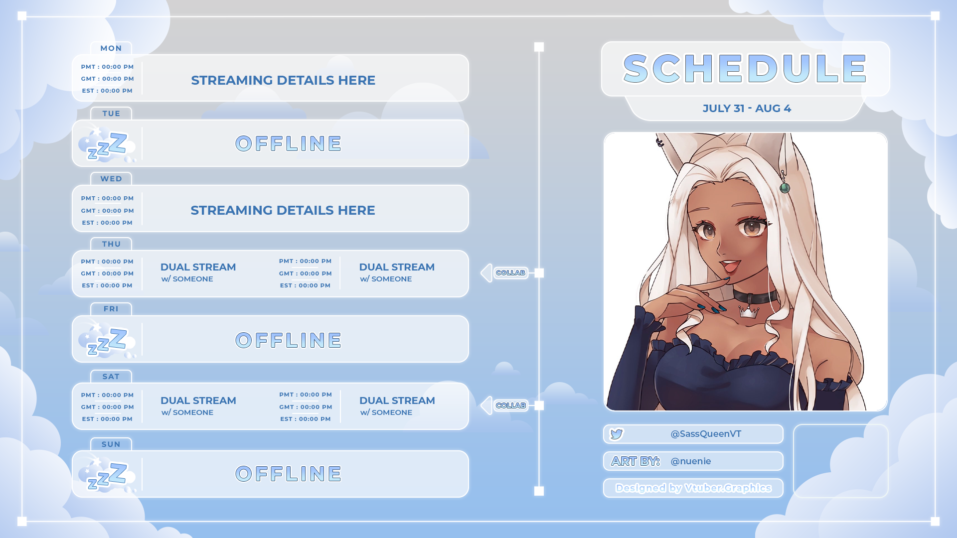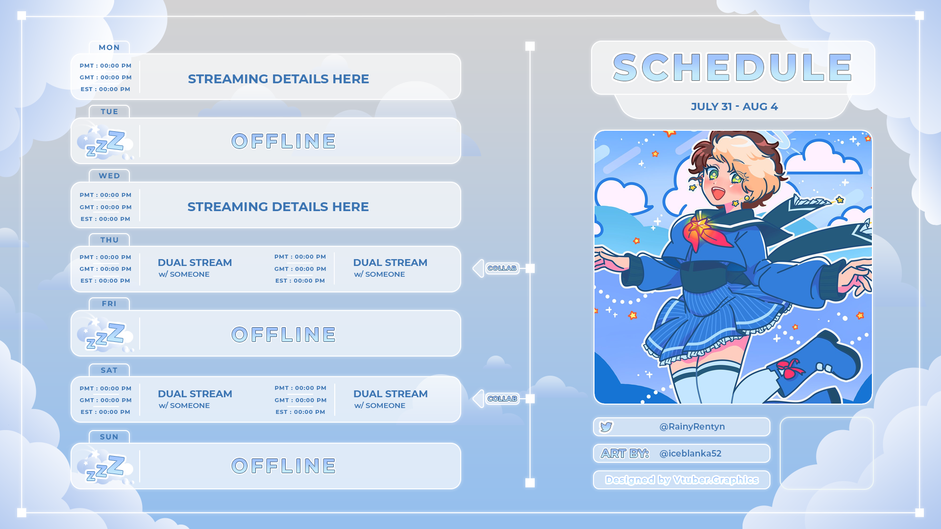 Upload your weekly streaming schedule with the help of Cloudy Schedule! Its airy, cloud-themed design helps your viewers stay up to date with what you'll be streaming each week on YouTube or Twitch. Keep things organized and on-track with this cute and efficient schedule design.