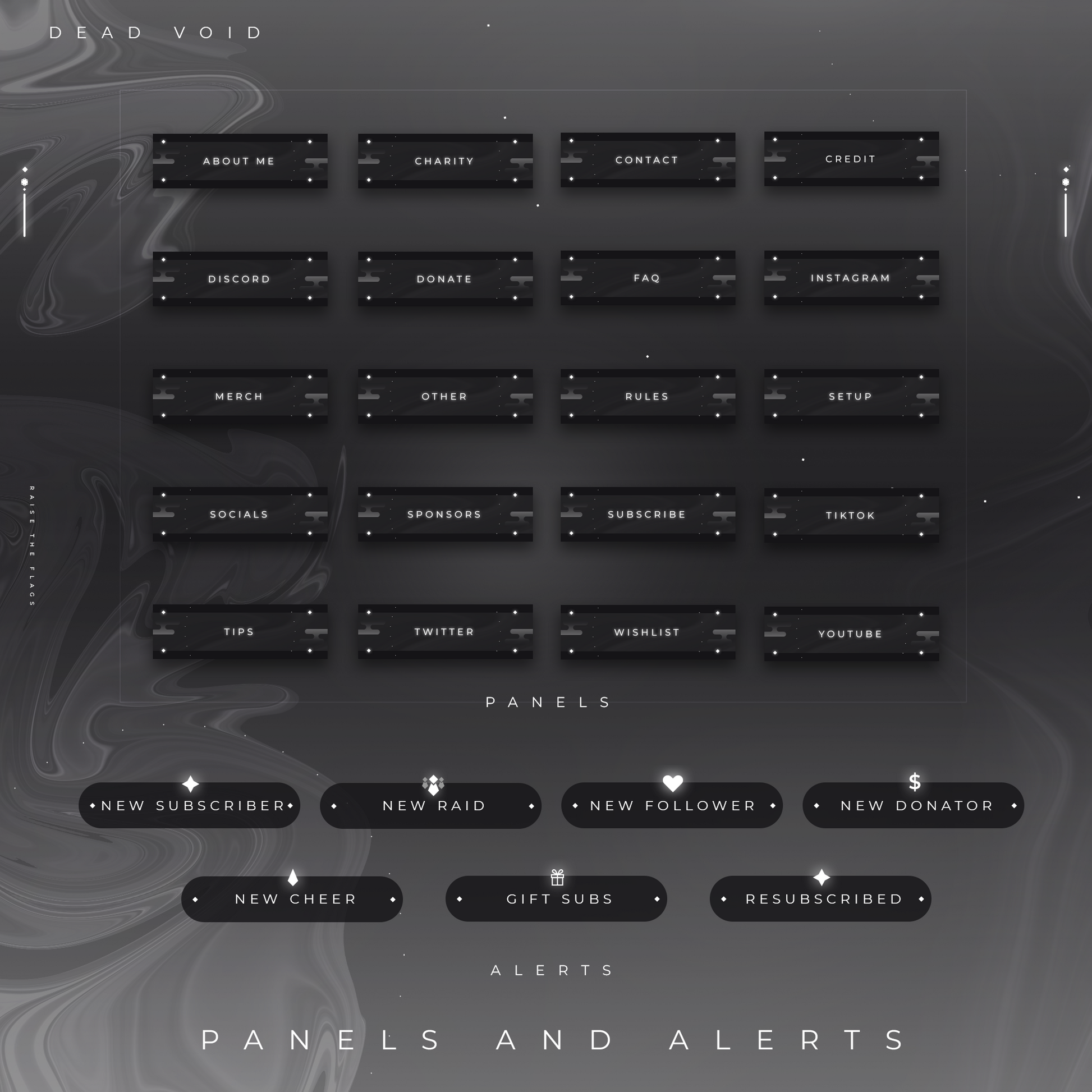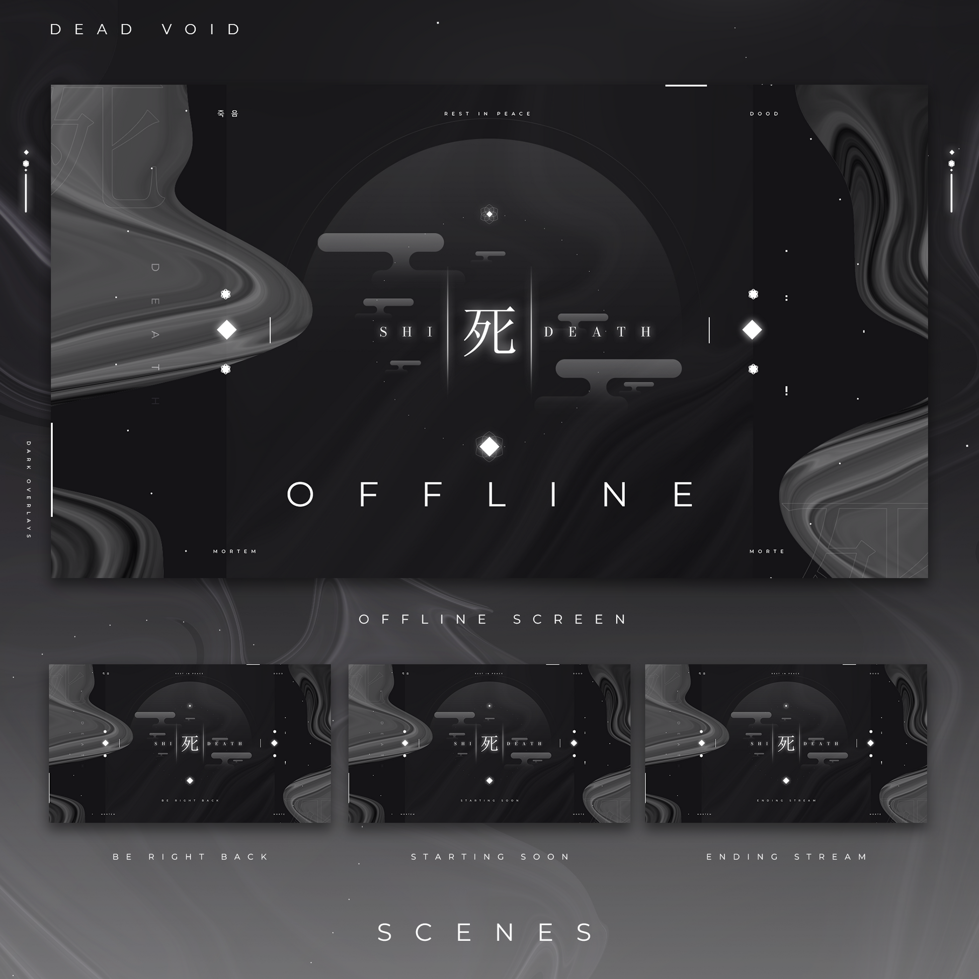 Dive into the unknown with our Dead Void stream package. Inspired by the deep abyss, this minimalist graphics set is perfect for those looking for a stream graphics package available in dark mode. Immerse yourself in the dark depths with our Dead Void Stream Package. Liven up your streams while maintaining a minimalist and dark aesthetic. Perfect for those who love deep and moody vibes.