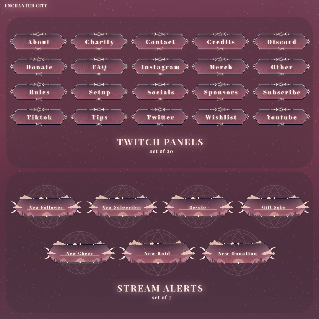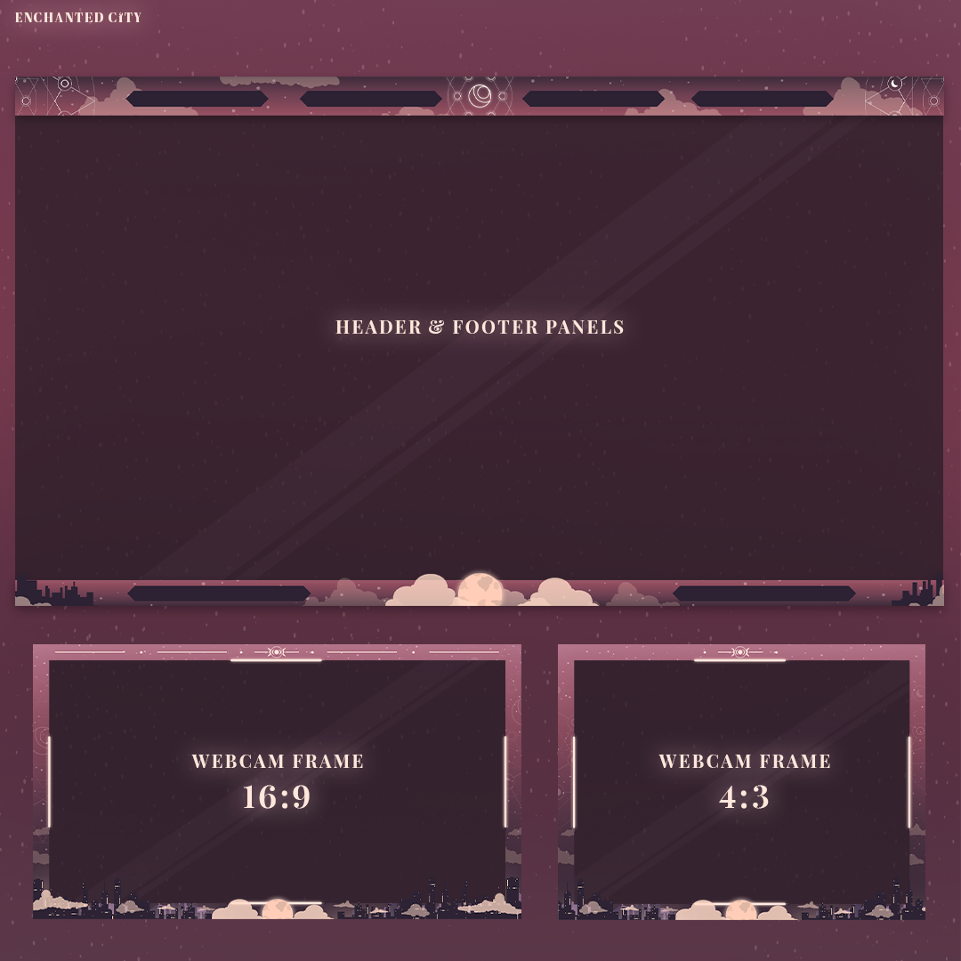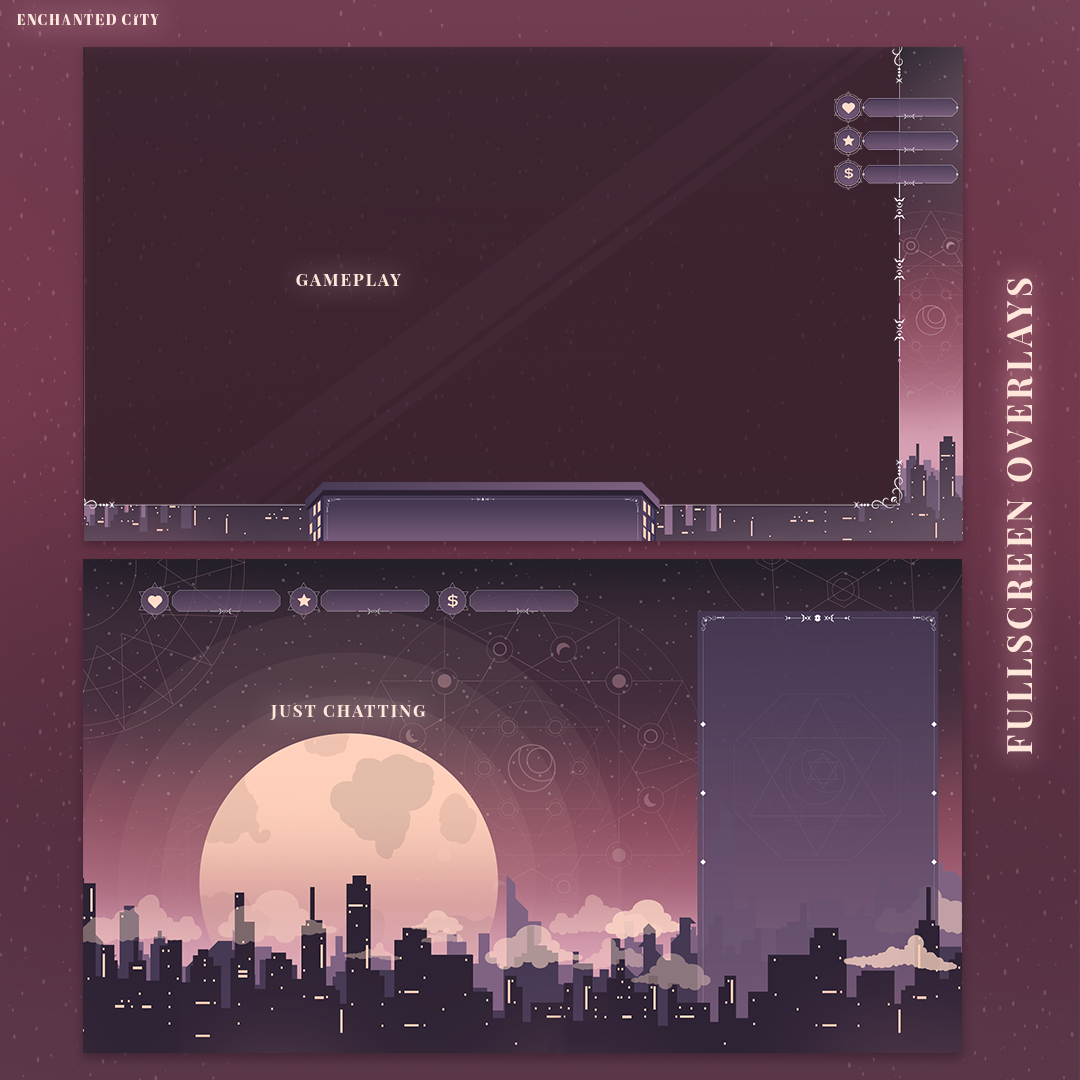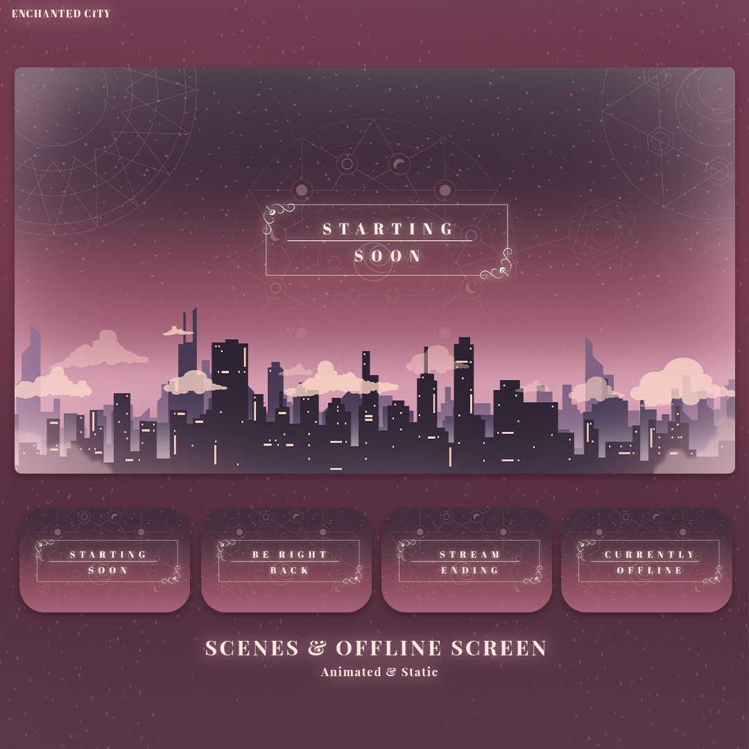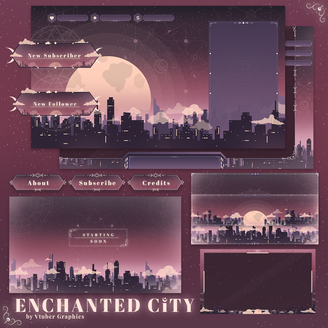 Turn your stream into a magical experience with our Enchanted City Stream Pack! This pack offers a mystical cityscape feel, featuring a stunning city skyline against a glowing moon, creating an enchanting atmosphere for your audience.