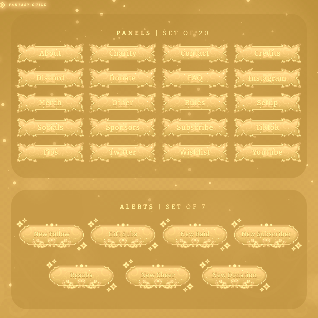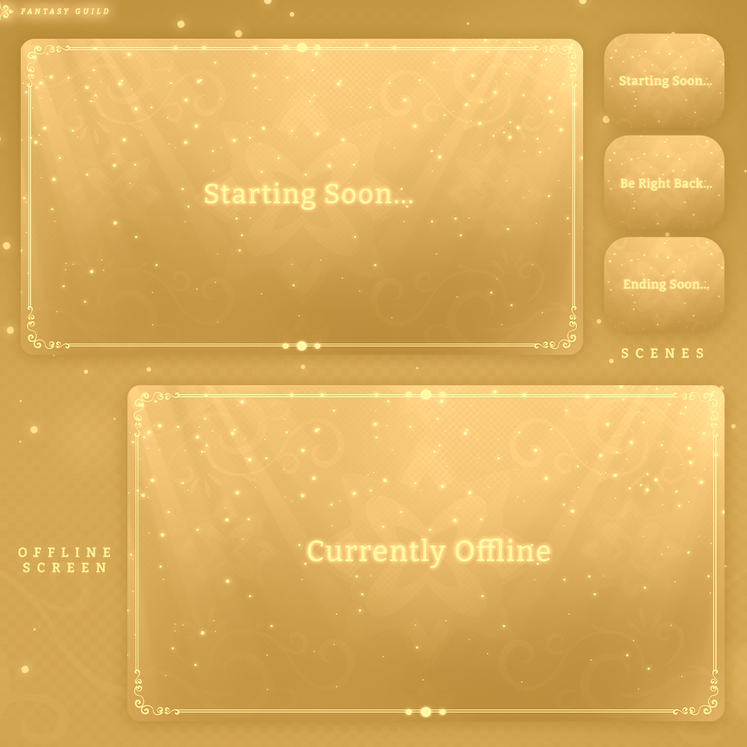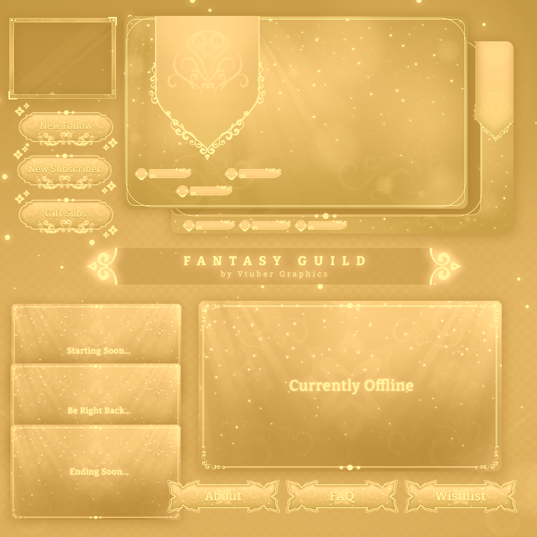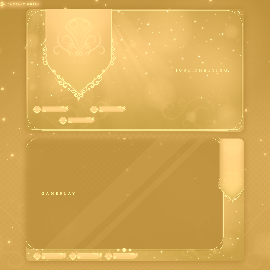 Level up your streaming game with the Fantasy Guild Stream Package! This MMORPG-inspired graphics pack is perfect for creating a mystical atmosphere for your Twitch streams. With royal colors and gold accents, we were inspired by our favorite RPG games to create this package. Digital download is available for immediate use upon checkout. Let the adventures begin!