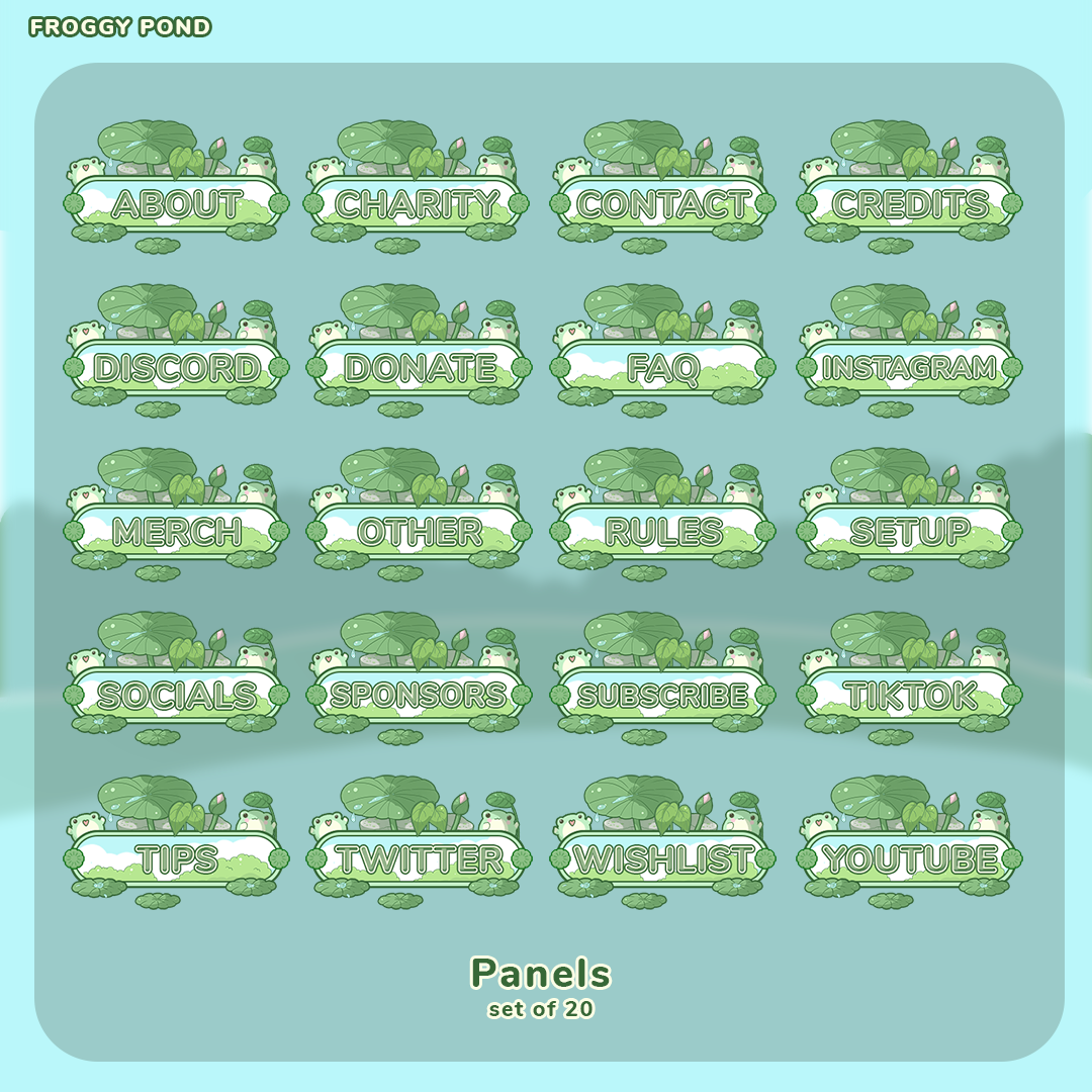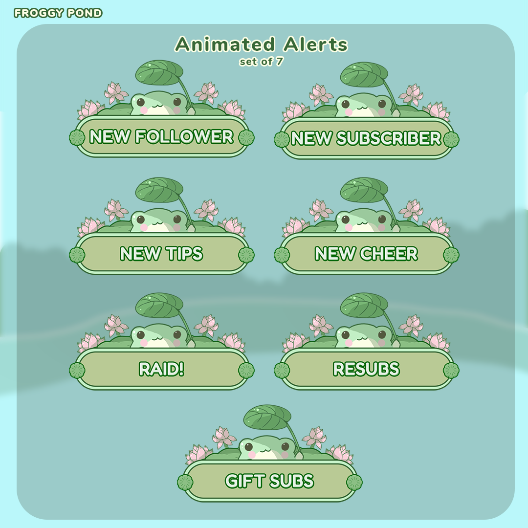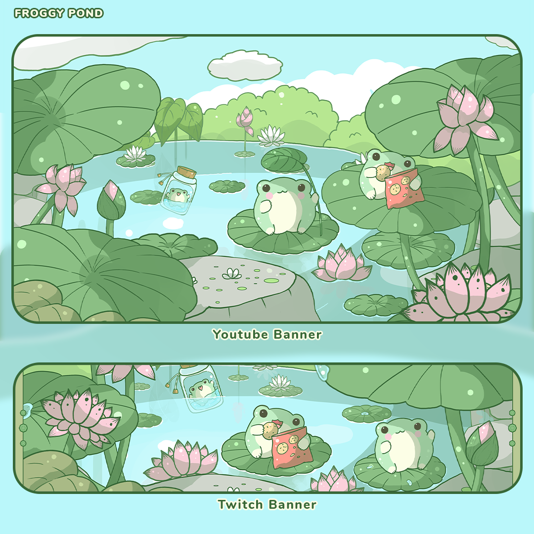 Decorate your stream to be the cutest on Twitch or Youtube with our Froggy Pond Stream Package! This graphics package features an adorable frog theme, perfect for any frog-loving vtubers. Your viewers can watch the happy frogs on stream as they tune into your stream. Hop on over and make a splash with Froggy Pond Stream Package.