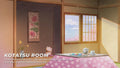 A cute anime bedroom featuring a kawaii pink kotatsu and maneki-neko.
