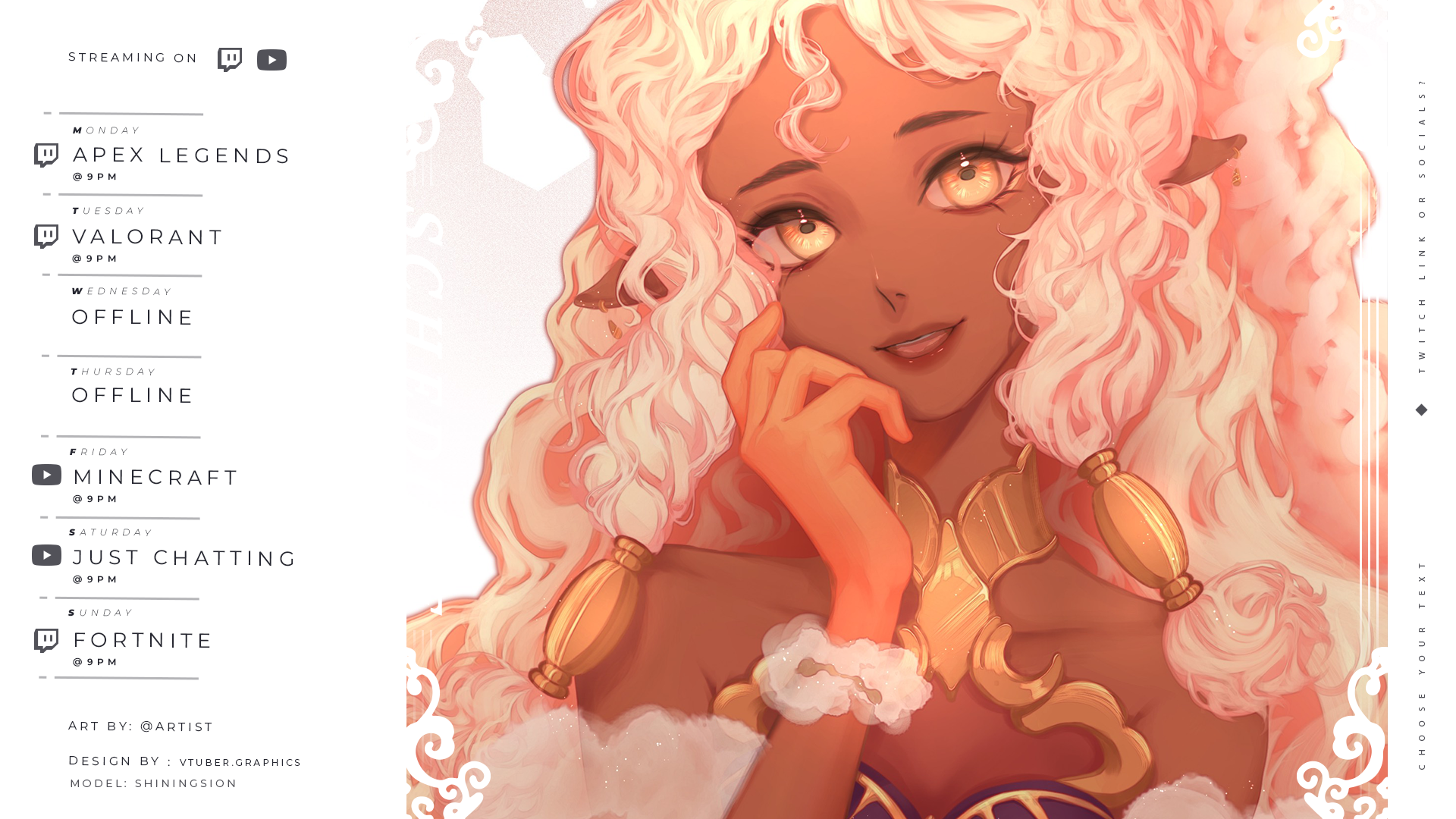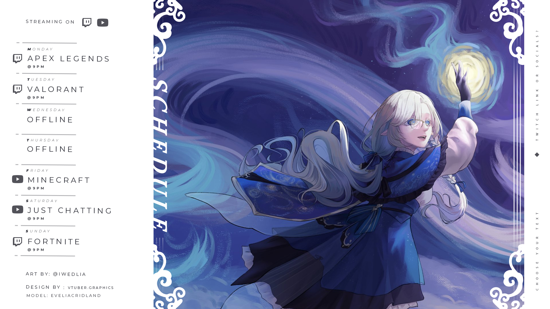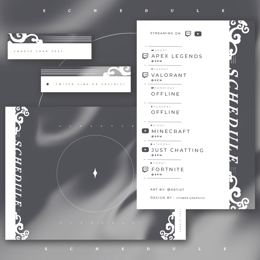 This digital download contains a premade schedule PSD to make your twitch and youtube streams stand out. Take control of your streams with this easy-to-use schedule.