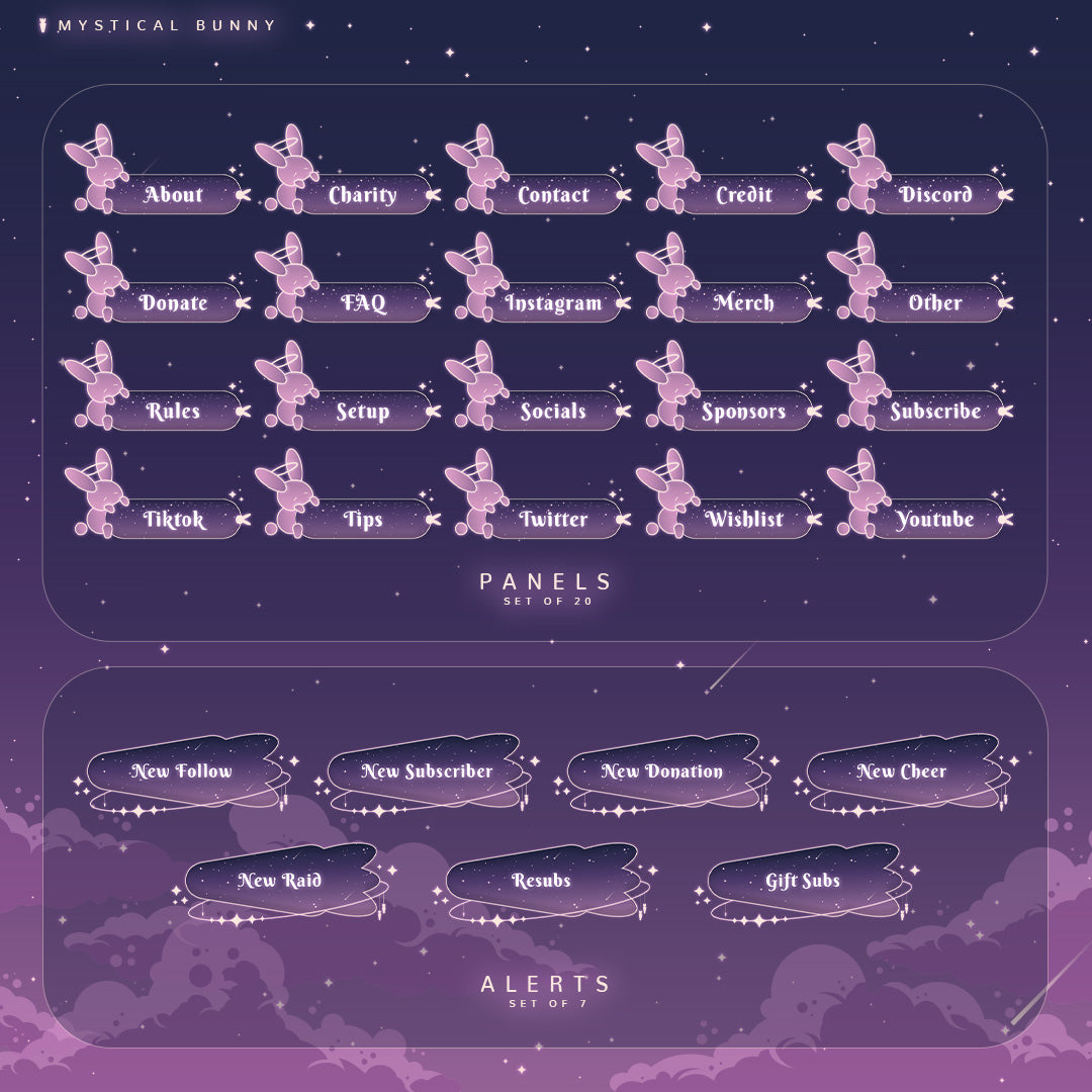 Upgrade your stream graphics with our Mystical Bunny Stream Package. This digital download is perfect for those who love the starry night sky and adorable bunnies. Embrace a whimsical vibe for your streams, making your audience hop with joy!