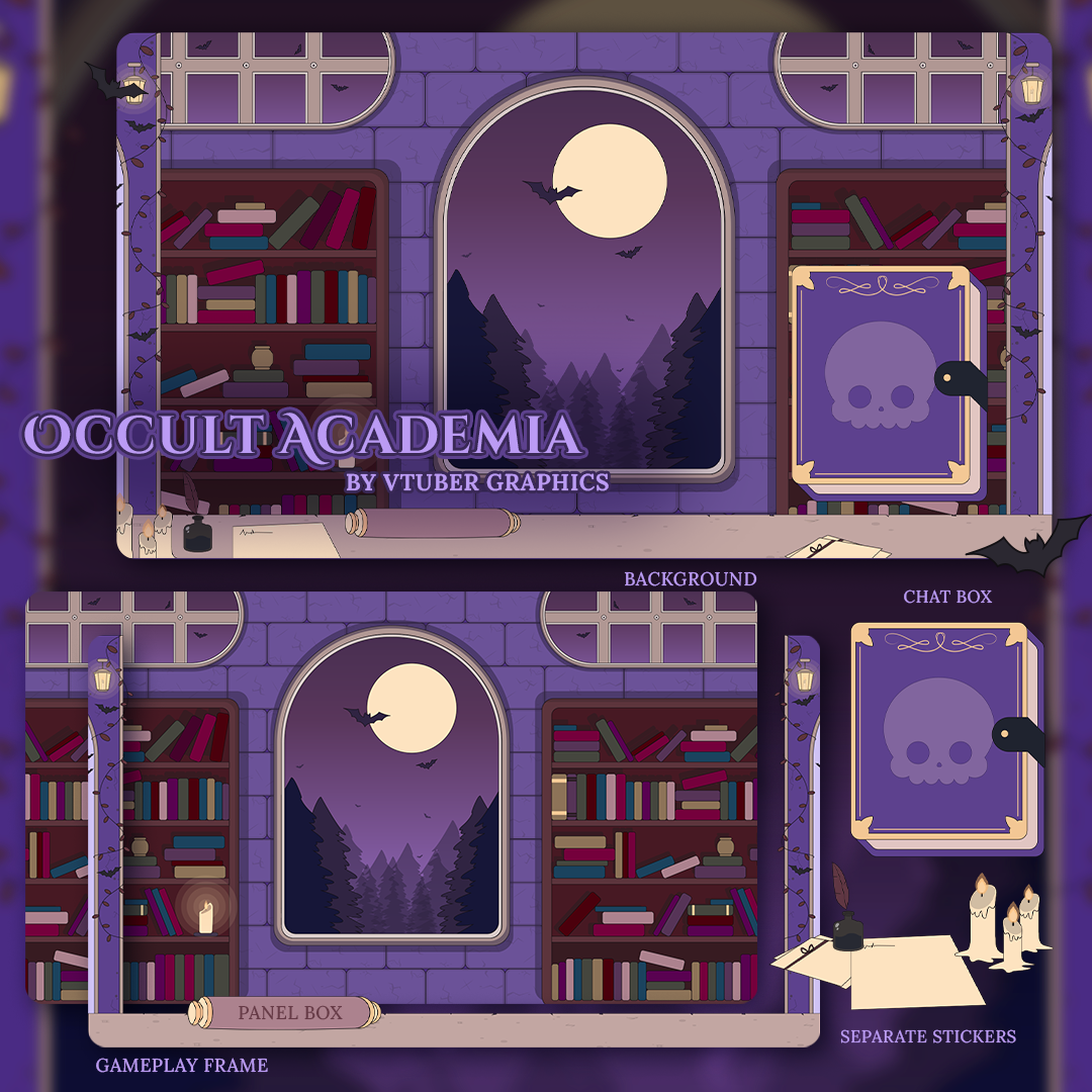 Unleash your inner witchy vibes with the Occult Academia Overlays. This spooky overlay pack is perfect for streaming and comes as a digital download. Channel major streaming spells and enhance your content with this uniquely crafted overlay pack. Get ready to brew up some views!๐ฎ๐