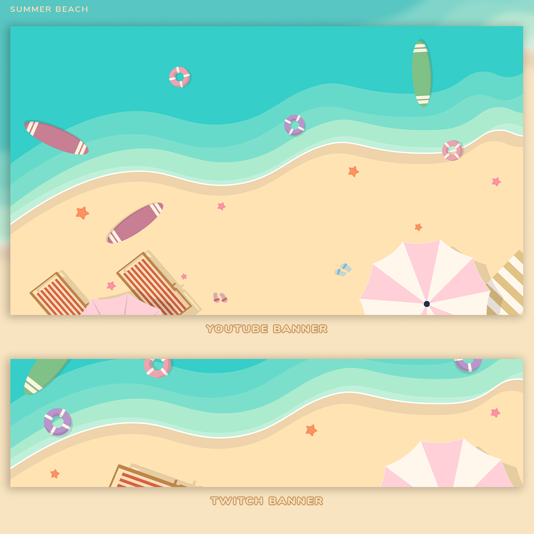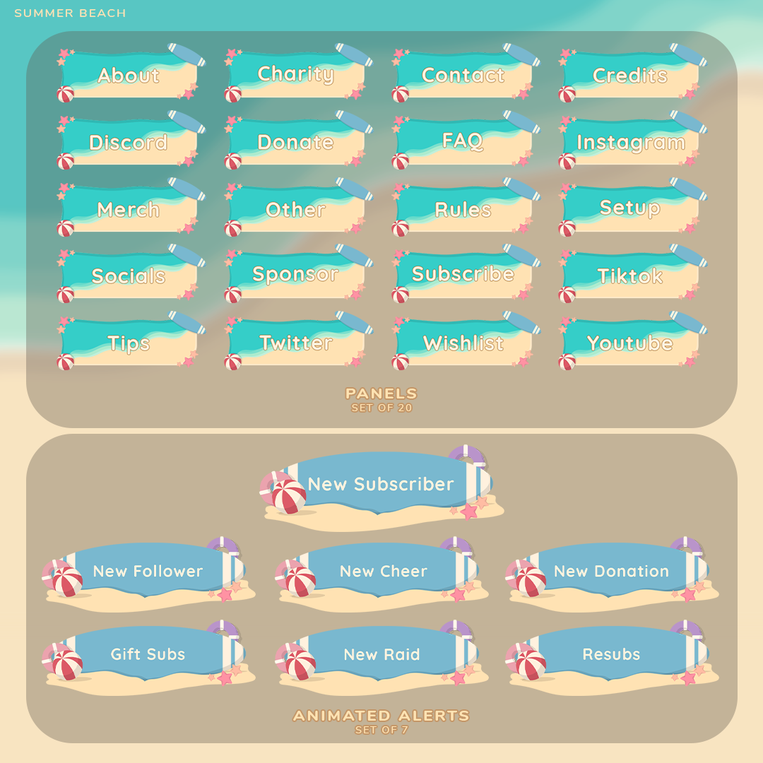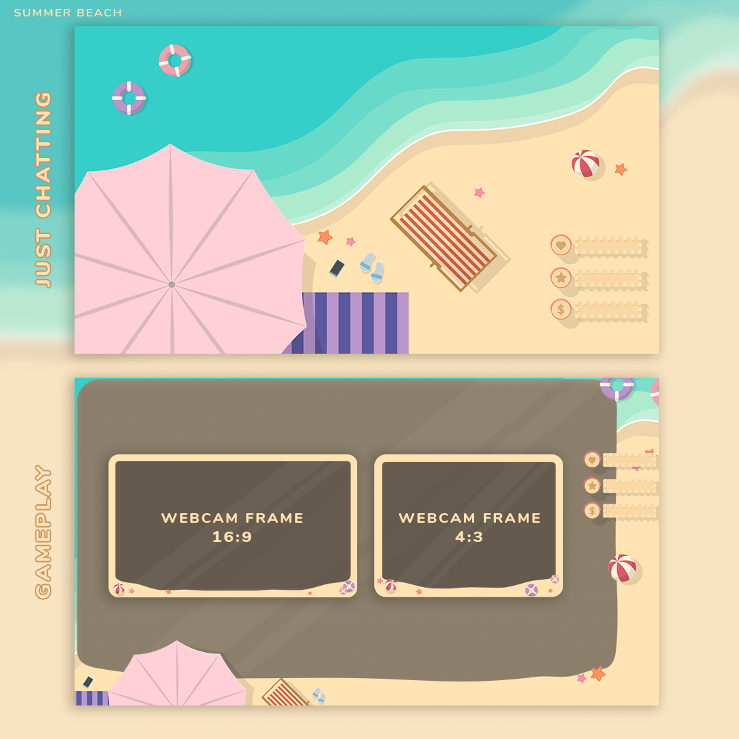 Transform your streams into a playful summer paradise with the Summer Beach Stream Package. This must-have digital download is perfect for Twitch or YouTube streamers, adding a beach themed vibe to your content. Lounge by the virtual beach and captivate your audience with this package.