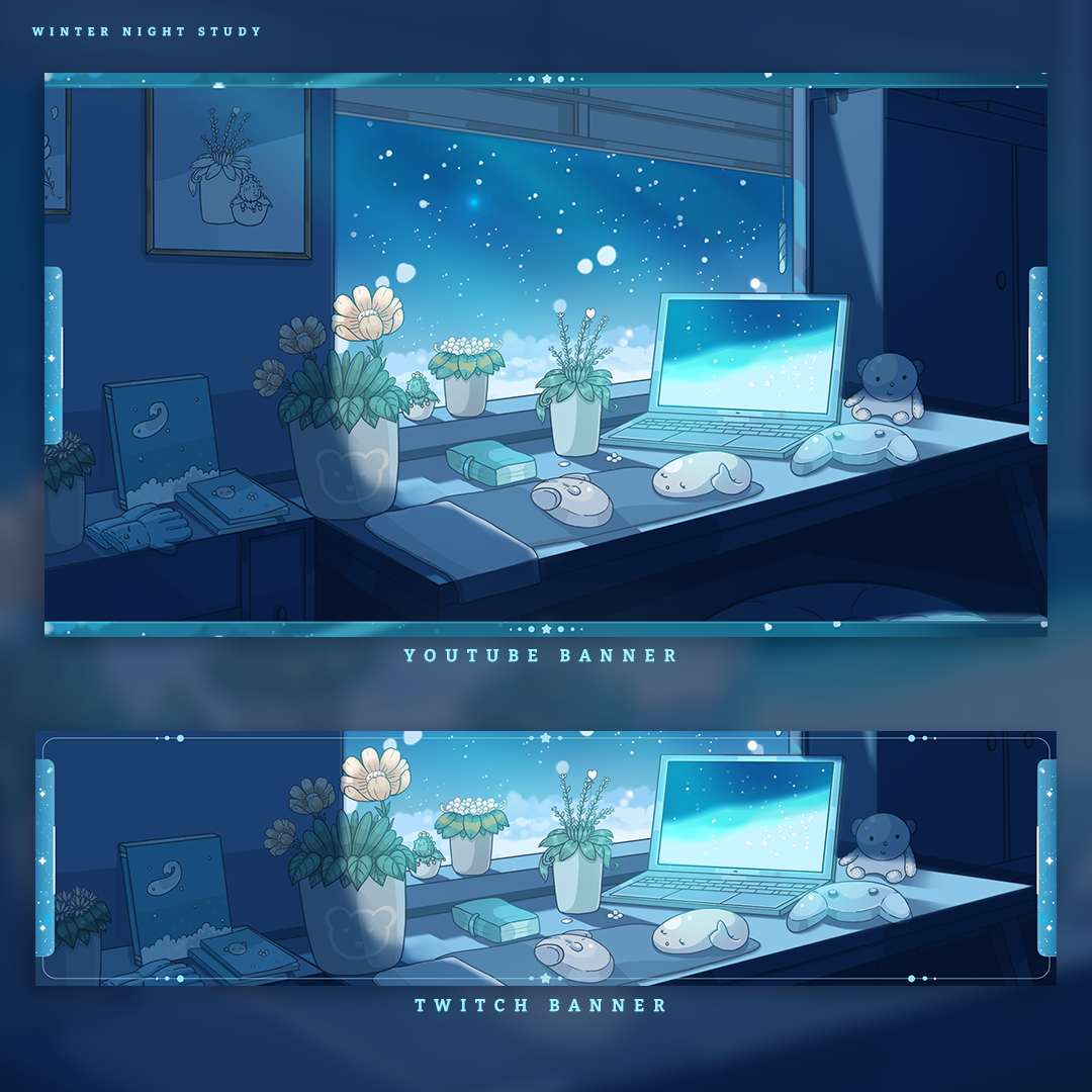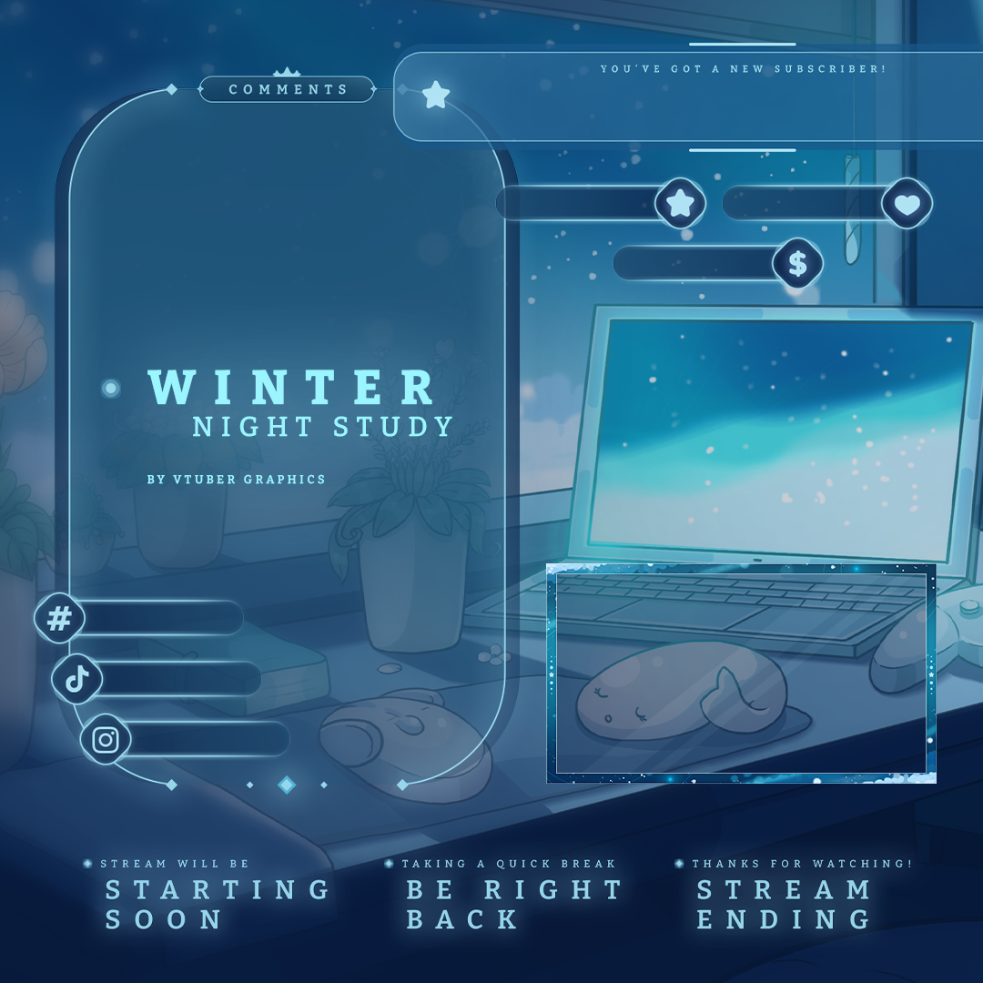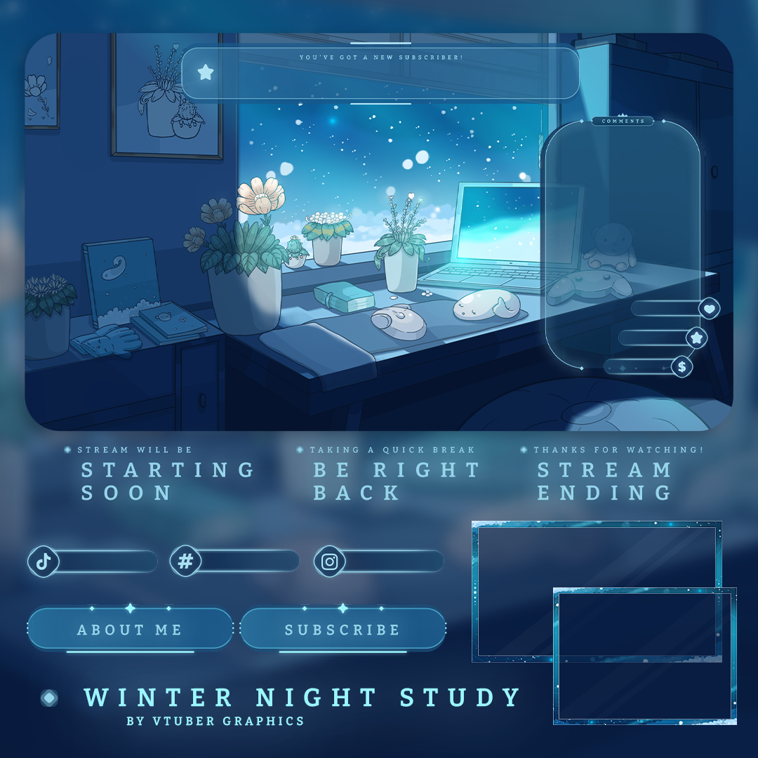 Help your viewers settle into some cozy streams with our Winter Night Study Stream Package! This digital download twitch graphics pack includes everything you need to set up a serene and visually stunning experience for your audience. For vtubers who appreciate a calm, blue aesthetic and love watching the snow outside their window.